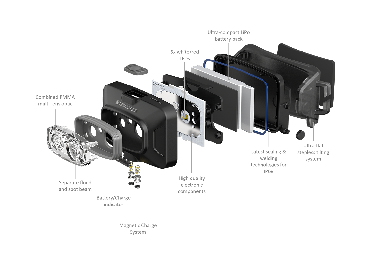 Ledlenser HF4R Core è il modello base sottile ed estremamente leggero per l'uso quotidiano. Quando si cammina o si va in campeggio, convince per l'illuminazione ottimale del campo vicino e lontano, grazie alle due fonti luminose e alla luce rossa frontale. La testa della lampada orientabile in modo continuo garantisce flessibilità, mentre l'archetto stretto e regolabile individualmente è ben saldo sulla testa. La batteria ricaricabile integrata può essere ricaricata in modo rapido e semplice grazie al sistema di ricarica magnetica. Altre caratteristiche intelligenti sono il pratico blocco per il trasporto e l'indicatore del livello di carica e della batteria.