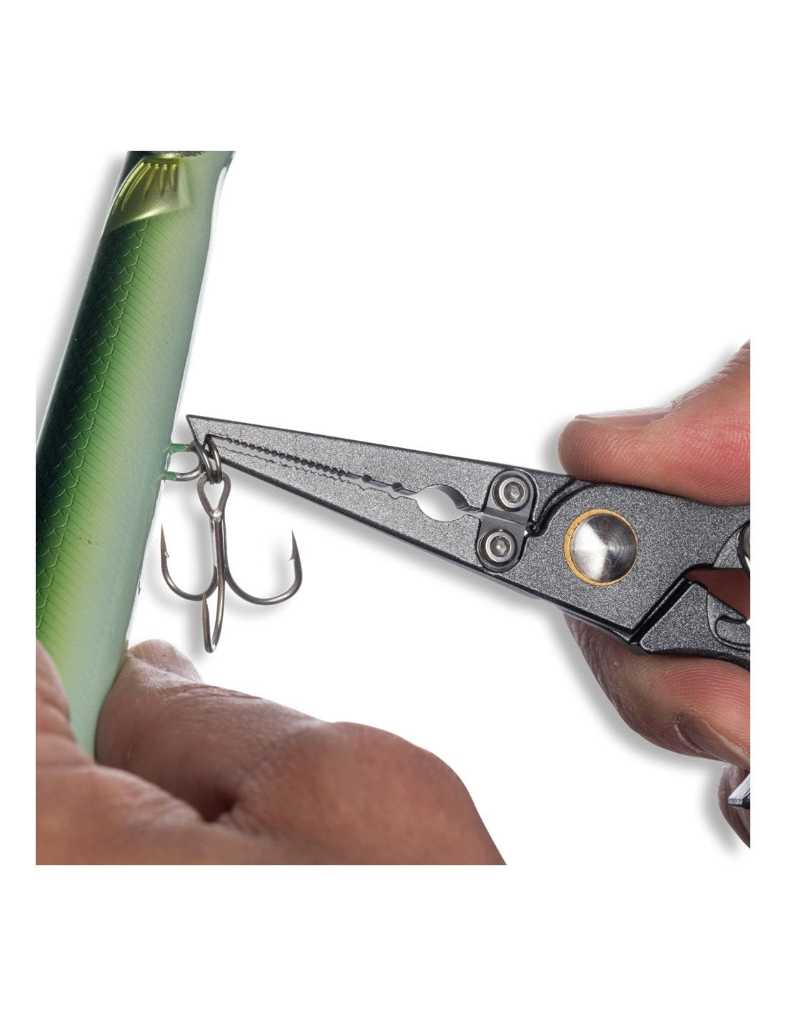 Pinza in alluminio leggero e multifunzionale è progettata per tutti i pescatori, offre versatilità e resistenza. Grazie all'impugnatura asimmetrica, garantisce una presa sicura e agevola l'applicazione della forza, rendendo più semplice il cambio degli ami. Il meccanismo di blocco e sblocco con un solo tocco permette un utilizzo rapido, mentre la punta anodizzata previene la ruggine, assicurando durabilità. Dotata di apri anello, taglia filo e dispositivo ghiera, questa pinze è uno strumento completo per ogni situazione di pesca.